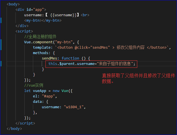 在子组件中,使用this.$parent可以直接访问该组件的父实例或组件,【类似于原生或者jquery中获取父节点的方式,但是并没有操作dom】
