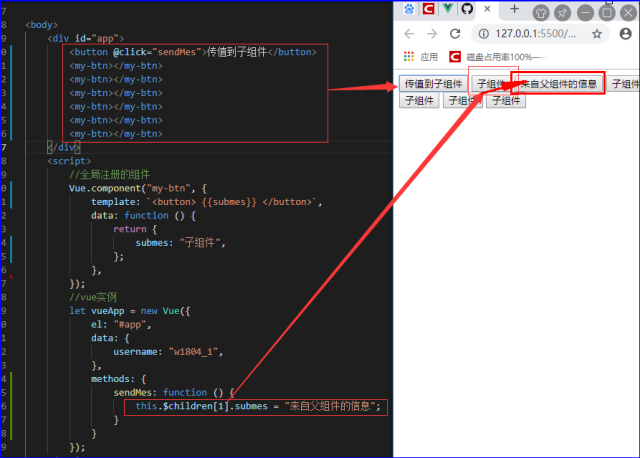 在父组件中,使用this.$children访问它所有的子组件,当子组件较多时可以通过子组件索引名称来实现查找。【类似于原生或者jquery中获取子节点的方式】