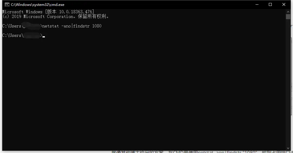 方案一: 就像其他博主给出的方案,在CMD里使用netstat -aon|findstr "1080",找到占用端口进程的PID,在任务管理器里结束进程。