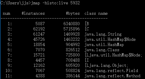 命令:jmap -histo:live pid 描述:显示堆中对象的统计信息
