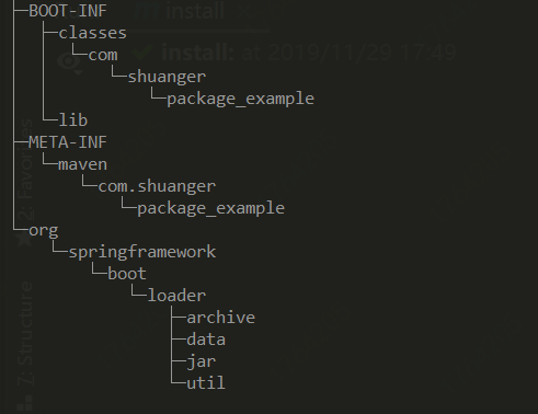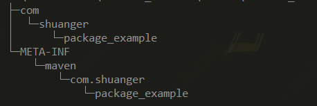 使用上述配置,也会在target下生成两个jar包,一个是可以被依赖的jar包:package_example-1.0.0-lib.jar。 一个是执行的jar包:package_example-1.0.0.jar.那生成的可执行的jar包和可被依赖的jar包有什么区别呢。来让我们看一看两个包的结构: