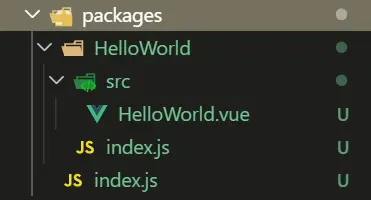 //不熟悉配置的可官网查看 https://cli.vuejs.org/zh/config/#pages module.exports = { pages: { index: { entry: 'examples/main.js', template: 'public/index.html', filename: 'index.html' } } } - 进入packages目录创建一个组件目录(HelloWorld),一个index文件(用来暴露所有的组件),然后在组件目录新建index(暴露出当前组件)文件与src组件源码。