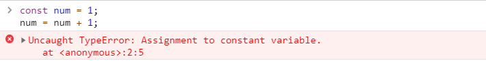const的方式来进行声明的,当我们重新为变量num进行赋值时,JS尝试为其分配新的内存地址,那么这里也就是抛出错误的地方,因为我们明确不允许对其进行修改。