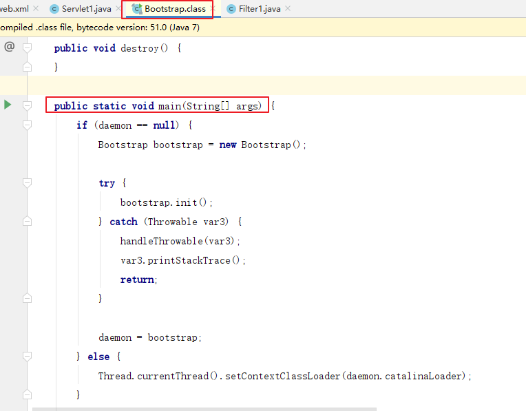 简单概括:接收前端页面的响应,进行业务逻辑处理,然后发出响应。 其中接收响应,发送响应都是tomcat帮我们干的。在javaEE中我们开发一个程序都是通过main()方法为入口,调用其它方法。来到了javaSe我们发现我们并没有接触main()方法,程序也能正常运行。其实tomcat中是有这个main方法的,就在lib里的catalina.jar里,下面我们看看他是怎么被调用的。