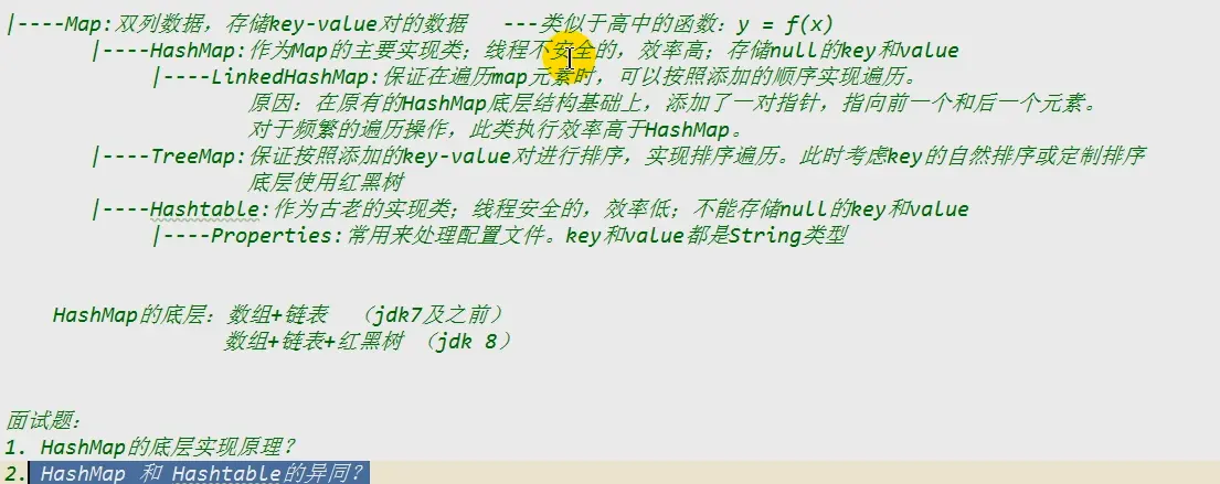 - Map接口的常用实现类:HashMap、TreeMap、LinkedHashMap和Properties。其中,HashMap是Map接口使用频率最高的实现类。
