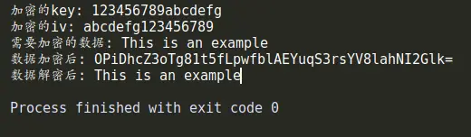 let key = '123456789abcdefg';console.log('加密的key:', key);let iv = 'abcdefg123456789';console.log('加密的iv:', iv);let data = "This is an example";console.log("需要加密的数据:", data);let crypted = encrypt(key, iv, data);console.log("数据加密后:", crypted);let dec = decrypt(key, iv, crypted);console.log("数据解密后:", dec);