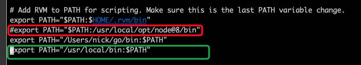 #export PATH="$PATH:/usr/local/opt/node@8/bin" #注释掉这行