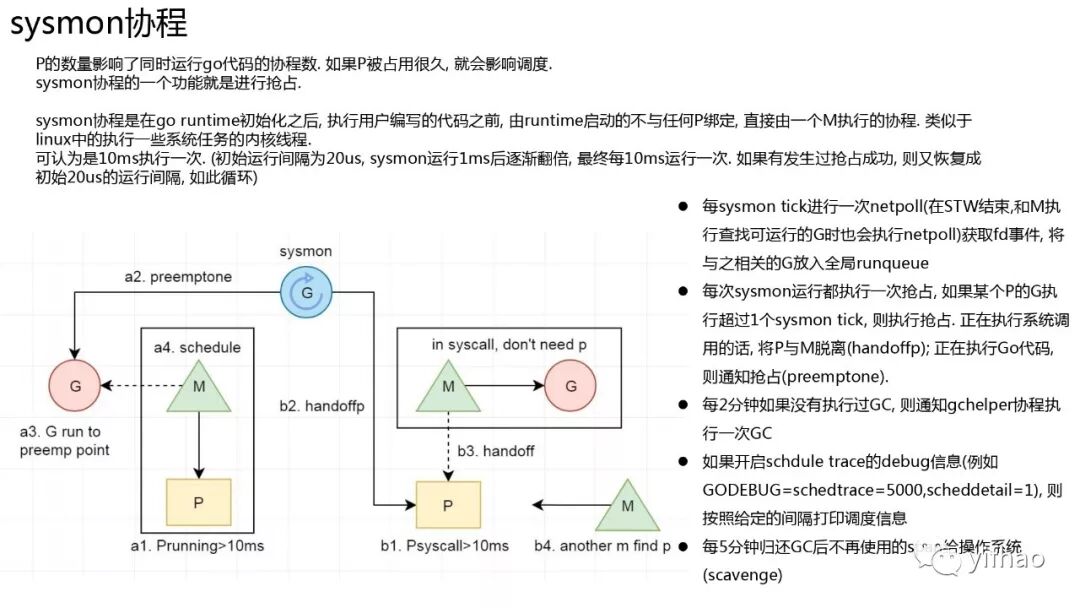 在go运行时中也有类似的协程, sysmon. 功能比较多: 定时从netpoll中获取ready的协程, 进行抢占, 定时GC,打印调度信息,归还内存等定时任务