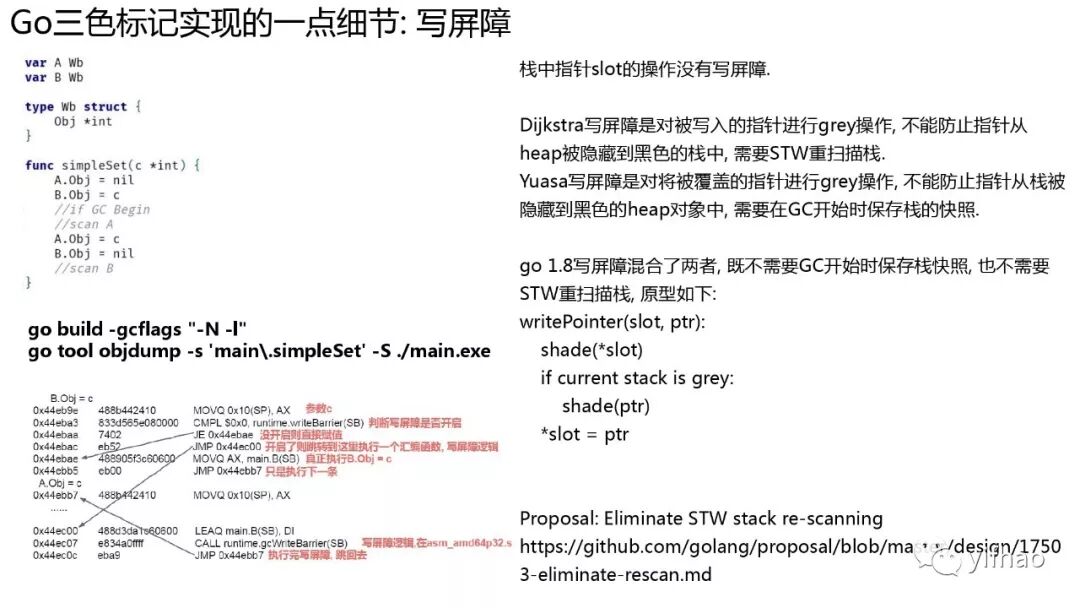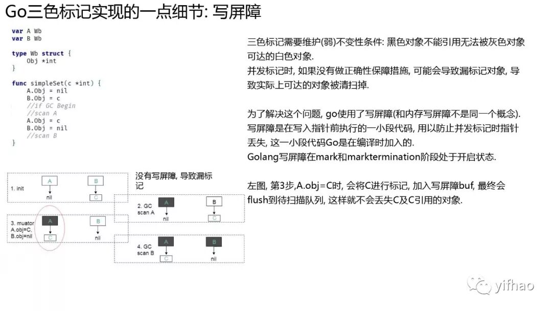 如何解决这个问题? go使用了写屏障, 这里的写屏障是指由编译器生成的一小段代码. 在gc时对指针操作前执行的一小段代码, 和CPU中维护内存一致性的写屏障不太一样哈. 所以有了写屏障后, 第3步, A.obj=C时, 会把C加入写屏障buf. 最终还是会被扫描的.