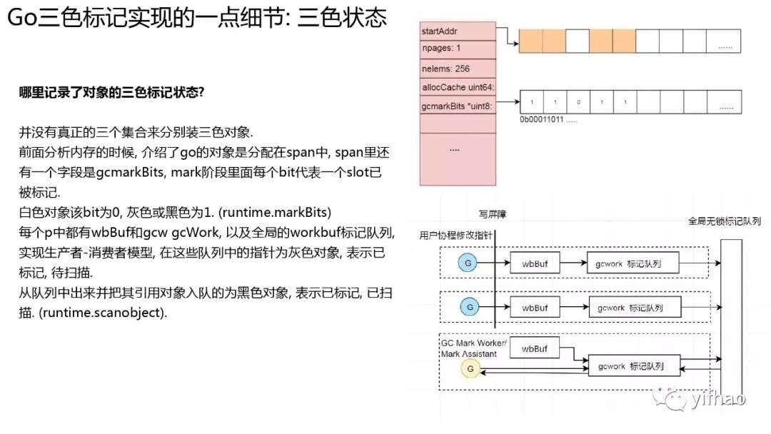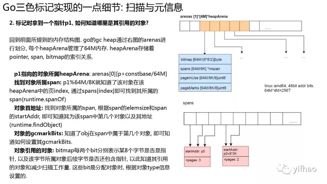 结合heapArean的bitmap和每8个字节在heapArean中的偏移, 就可知道对象每8个字节是指针还是普通数据(这里的bitmap是在分配对象时根据type信息就设置了, type信息来源于编译器生成)