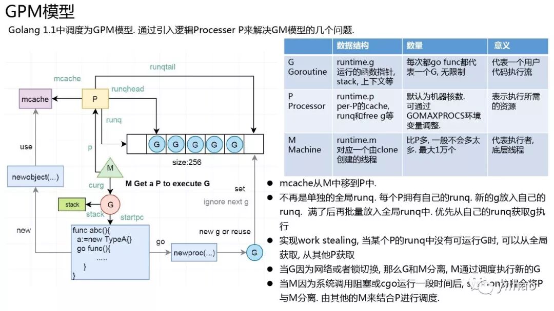 在1.1中调度模型更改为GPM模型, 引入逻辑Process的概念, 表示执行Go代码所需要的资源, 同时也是执行Go代码的最大的并行度. 这个概念可能很多人不知道怎么理解. P涉及到几点, 队列和mcache, 还有P的个数的选取. 首先为什么把全局队列打散, 以及mcache为什么跟随P, 这个在GM模型那一页就讲的比较清楚了. 然后为什么P的个数默认是CPU核数: Go尽量提升性能, 那么在一个n核机器上, 如何能够最大利用CPU性能呢? 当然是同时有n个线程在并行运行中, 把CPU喂饱, 即所有核上一直都有代码在运行. 在go里面, 一个协程运行到阻塞系统调用, 那么这个协程和运行它的线程m, 自然是不再需要CPU的, 也不需要分配go层面的内存. 只有一直在并行运行的go代码才需要这些资源, 即同时有n个go协程在并行执行, 那么就能最大的利用CPU, 这个时候需要的P的个数就是CPU核数. (注意并行和并发的区别)