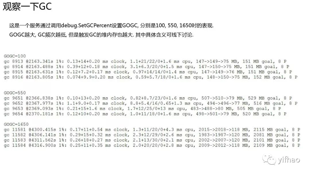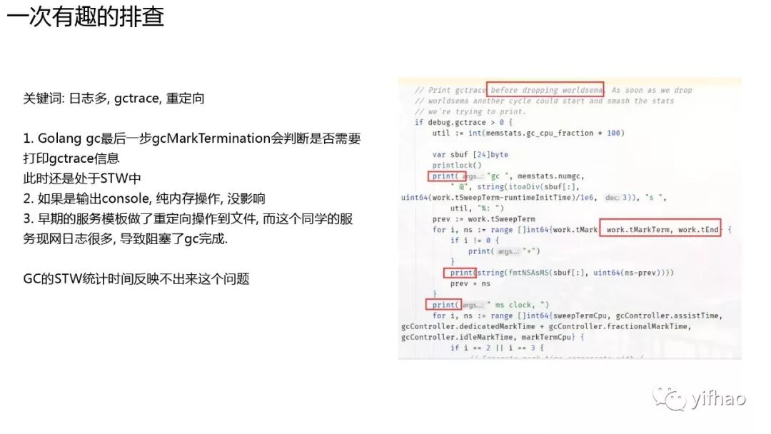 这里更正一下ppt中的内容, 并不是因为gc没完成而导致其他协程不能运行, 而是后续gc无法开启, 导致实质上的stw. 打印gc trace日志时, 已经start the world了, 其他协程可以开始运行了. 但是在打印gctrace日志时, 还保持着开启gc需要的锁, 所以, 打印gc trace日志一直没完成, 而gc又比较频繁, 比如0.1s一次, 这样会导致下一次gc开始时无法获取锁, 每一个进入gc检查的p阻塞, 实际上就造成了stw.