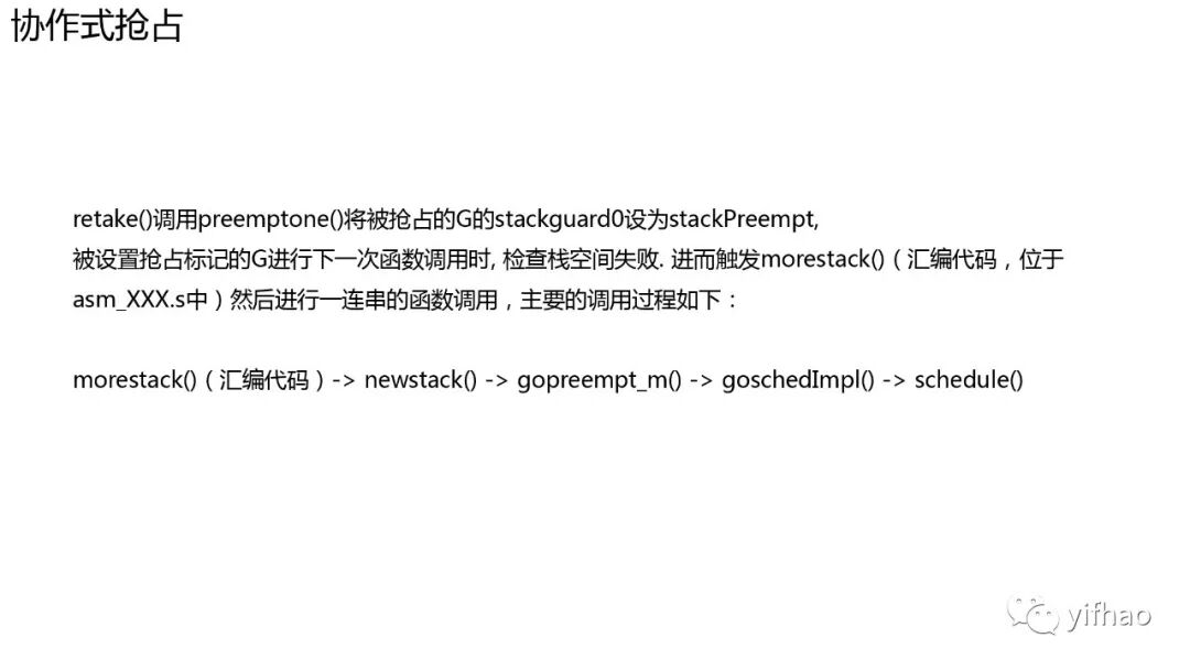 go目前(1.12)还没有实现非协作的抢占. 基本流程是sysmon协程标记某个协程运行过久, 需要切换出去, 该协程在运行函数时会检查栈标记, 然后进行切换.