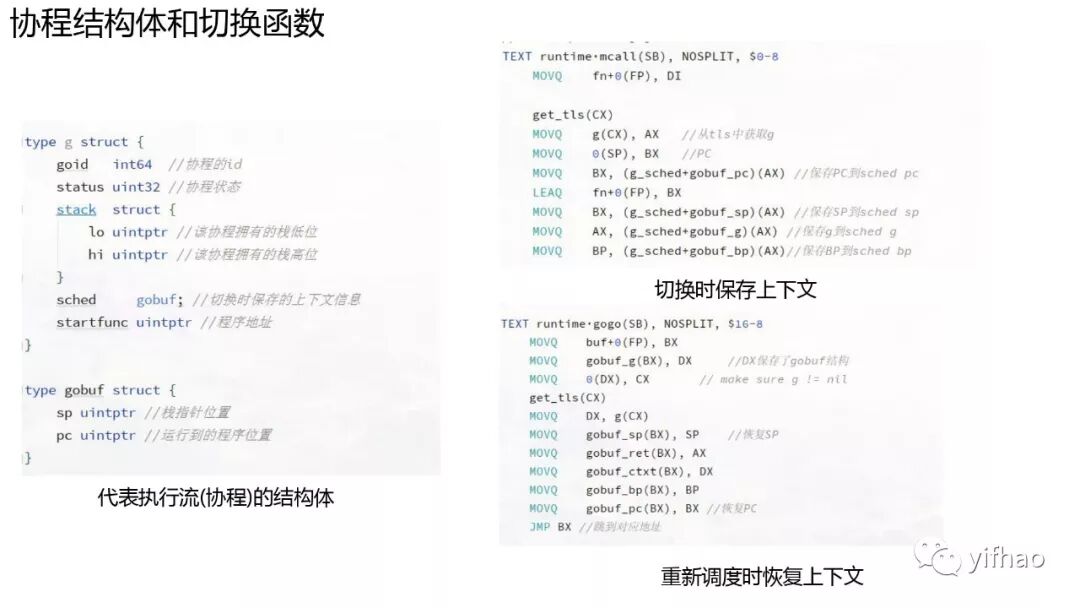 一个协程代表了一个执行流, 执行流有需要执行的函数(对应上面的func1), 有函数的入参(a1, a2), 有当前执行流的状态和进度(对应CPU的PC寄存器和SP寄存器), 当然也需要有保存状态的地方, 用于执行流恢复. 真正代表协程的是runtime.g结构体. 每个go func都会编译成runtime.newproc函数, 最终有一个runtime.g对象放入调度队列. 上面的func1函数的指针设置在runtime.g的startfunc字段, 参数会在newproc函数里拷贝到stack中, sched用于保存协程切换时的pc位置和栈位置. 协程切换出去和恢复回来需要保存上下文, 恢复上下文, 这些由以下两个汇编函数实现. 以上就能实现协程这种执行流, 并能进行切换和恢复. (下图中的struct和函数都做了精简)