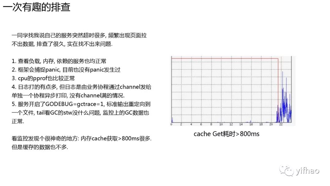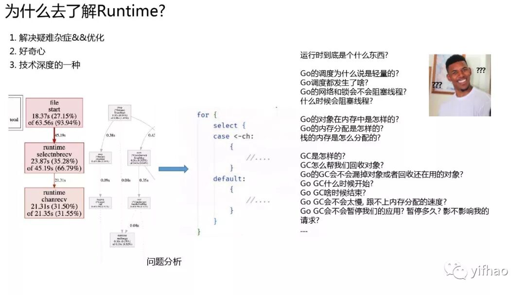 可以解决一些棘手的问题: 在写这个PPT的时候, 就有一位朋友在群里发了个pprof图, 说同事写的代码有问题, CPU利用率很高., 找不出来问题在哪, 我看了下pprof图, 说让他找找是不是有这样用select的, 一查的确是的. 平时也帮同事解决了一些和并发, 调度, GC有关的问题