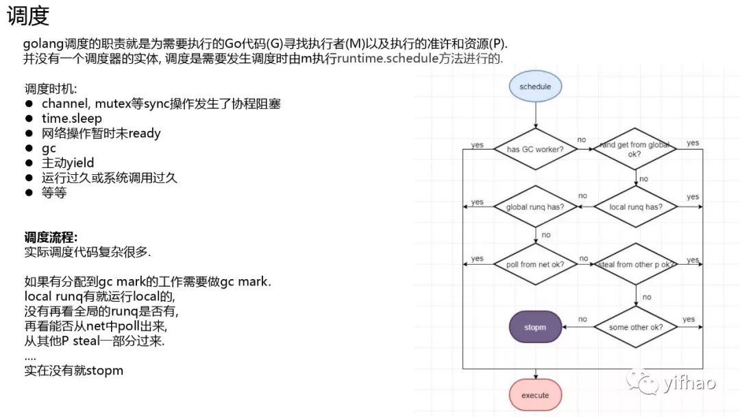 并没有一个一直在运行调度的调度器实体. 当一个协程切换出去或新生成的m, go的运行时从stw中恢复等情况时, 那么接下来就需要发生调度. go的调度是通过线程(m)执行runtime.schedule函数来完成的.