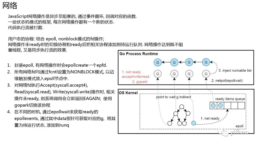 协程同理, 协程其实也是一个数据结构, 记录了要运行什么函数, 运行到哪里了. go在用户态实现调度, 所以go要有代表协程这种执行流的结构体, 也要有保存和恢复上下文的函数, 运行队列. 理解了阻塞的真正含义, 也就知道能够比较容易理解, 为什么go的锁, channel这些不阻塞线程. 对于实现的同步执行流效果, 又不阻塞线程的网络, 接下来也会介绍.
