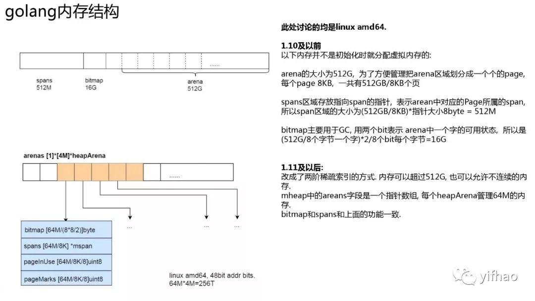 在全局的mheap struct中有个arenas二阶数组, 在linux amd64上,一阶只有一个slot, 二阶有4M个slot, 每个slot指向一个heapArena结构, 每个heapArena结构可以管理64M内存, 所以在新的版本中, go可以管理4M*64M=256TB内存, 即目前64位机器中48bit的寻址总线全部256TB内存.