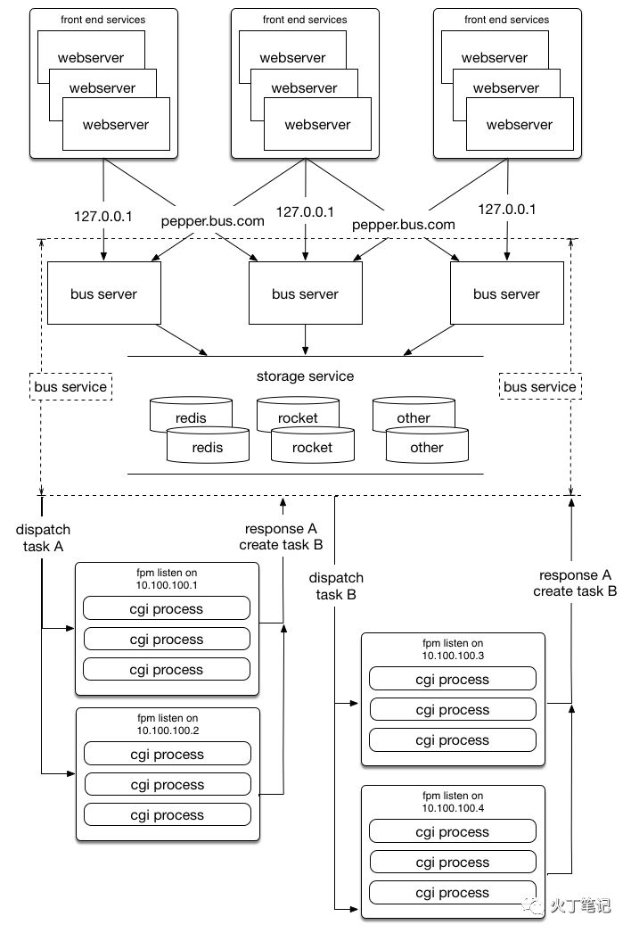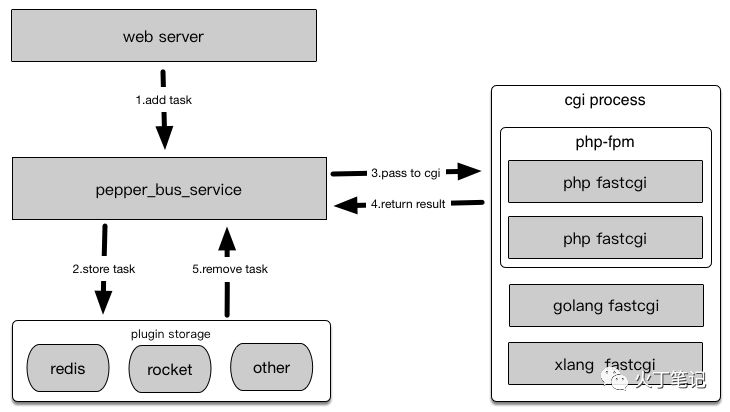最后,最重要的就是任务管理,一种模式是开进程,消费总线使用的存储中的数据,过程计时打点,同时总线系统提供必要的进程管理功能(SDK).因为我并不想让业务接入各种数据打点的sdk,想从总线上直接获取第一手的数据采集,针对php的场景,很自然想到了,能否直接与fastcgi进行通信,通信的响应时间,其实就是对于任务的处理时间,同时基于这种方式,可以直接享受到php-fpm可以动态的更新代码的红利。我们异步任务的脚本,也能平滑动态进行更新。当然后期针对fpm的数据转发和通信,包括php-fpm和脚本各种执行时间的配置,我们有过不少的挫折,但后来都迎刃而解。团队之前本身也是负责360的长连接相关技术,对于网络的处理还是有一定的经验的~