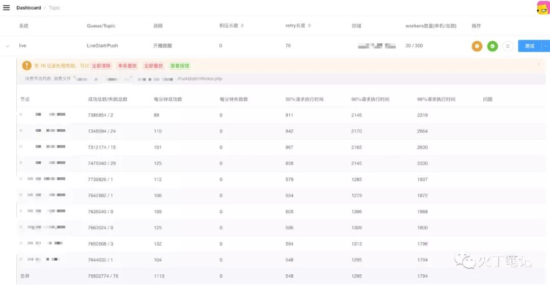 3.队列实时监控,可以进行重放清理等设定,新版已经支持灰度重放等。同时会实时显示请求延时,如图:第一列90%的请求在2146ms内完成。