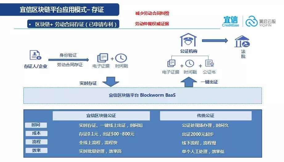 大家都知道,宜信有很多员工,在全国也有很多门店,所以我们在内部运用区块链技术做了一个尝试——对人员的劳动合同实现电签,这样不仅提高了效率而且降低了人员管理的成本。