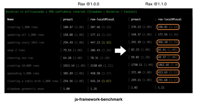 性能方面:在样式和布局(主线程)上所花的事件大幅减少, Rax@1.1.0 的均值 benchmark 指标相比 Rax@1.0.0 提升了 15.8% !各项性能指标离 preact 又更近了一步: