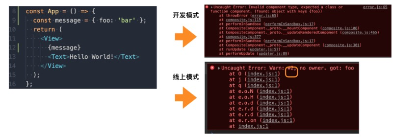 (3) 更好的异常提示和错误码功能,当开发者写出会触发异常的代码之后,Rax 会在 Dev 模式和 Build 模式下给出对应的错误信息: