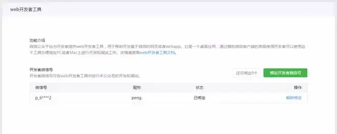 添加开发者 公众号登录管理后台,启用开发者中心,在开发者工具——web 开发者工具页面,向开发者微信号发送绑定邀请: