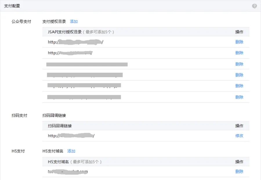 | 支付授权目录 | 产品中心-开发配置-支付授权目录 | 调起微信支付的页面所在的目录 | 5个 |