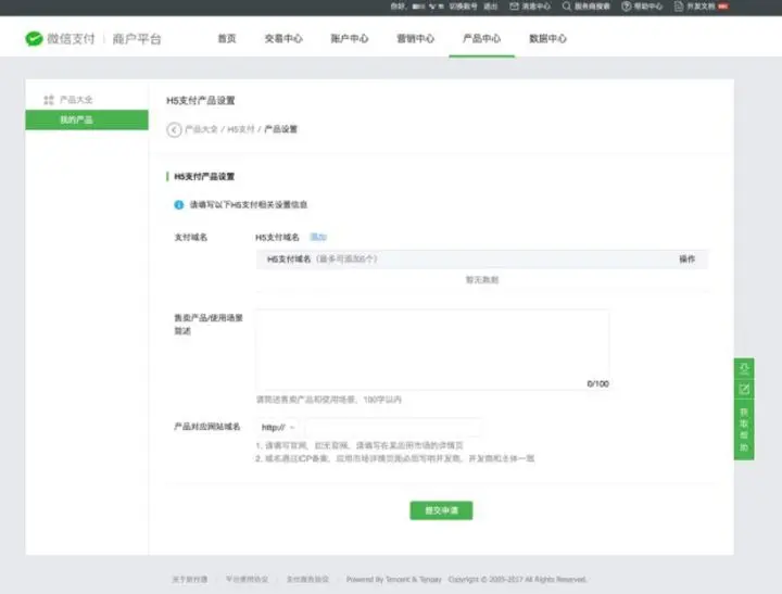 支付配置:登录商户平台-->产品中心-->我的产品-->支付产品→H5支付