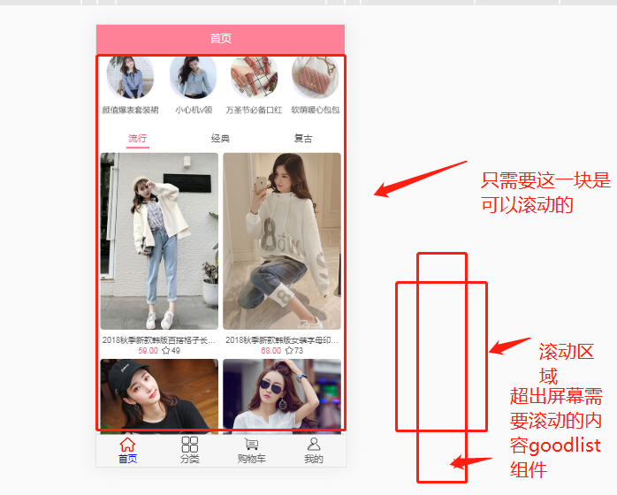 wrapper,也就是父容器,它会有固定的高度。 content,它是父容器的第一个子元素,它的高度会随着内容的大小而撑高。那么,当 content 的高度不超过父容器的高度,是不能滚动的,而它一旦超过了父容器的高度,我们就可以滚动内容区了,这就是
