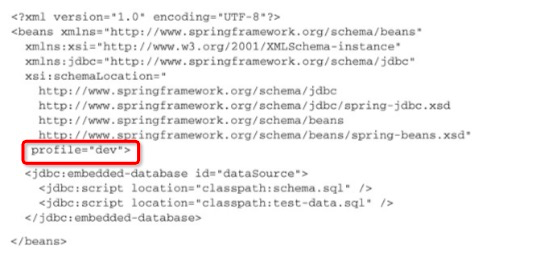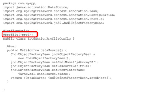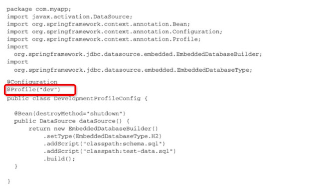 在Java配置中,可以使用@Profile注解指定某个bean属于哪一个profile。例如,在配置类中,嵌入式数据库的DataSource可能会配置成如 下所示: