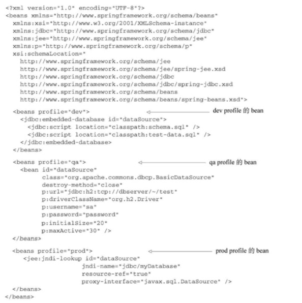 根元素中嵌套定义元素,而不是为每个环境都创建一个profile XML文件。这能够将所有的profile bean定义放到 同一个XML文件中: