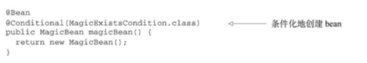 在Spring 4之前,很难实现这种级别的条件化配置,但是Spring4引入了一个新的@Conditional注解,它可以用到带有@Bean注解的方法上。如果给定的条件计算结果为true,就会创建这个bean,否则的话,这个bean会被忽略。