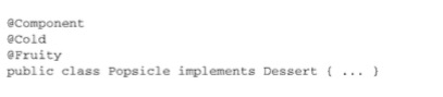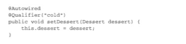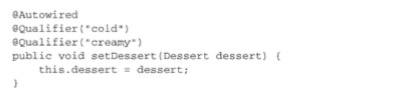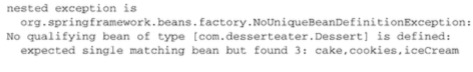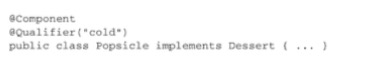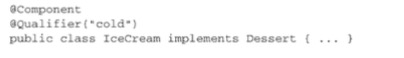 现在我们有了两个带有“cold”限定符的甜点。在自动装配Dessert bean的时候,我们再次遇到了歧义性的问题,需要使用更多的限定 符来将可选范围限定到只有一个bean。