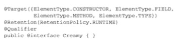 可以创建自定义的限定符注解,借助这样的注解来表达bean所希望限定的特性。这里所需要做的就是创建一个注解,它本身要使 用@Qualifier注解来标注。