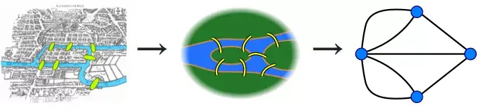 为了分析并解决这个问题,人们把该问题做了进一步的抽象:将割裂的区域抽象成一个节点,连接两个区域的桥抽象成两个节点之间的一条边,进一步将该问题转换成了最早的有关图论的问题:柯尼斯堡七桥问题,也叫作一笔画问题。
