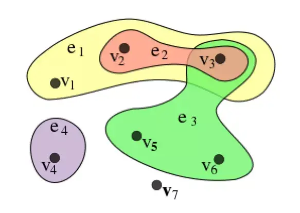 在超图中,实体之间是通过超边进行连接的。一条超边对应一类关系,如图所示,相同颜色区域中的实体之间都是该类边。