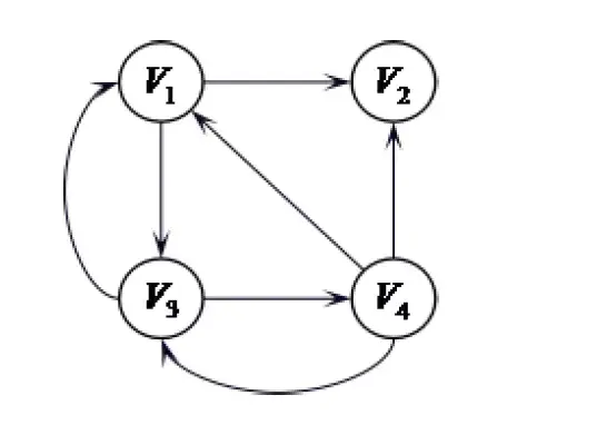 以该有向图为例,我们使用邻接矩阵的形式来表示图中的节点和边,矩阵为|V| * |V|规模的方阵,矩阵中的值表示两个节点之间是否存在关系,如果有则置为1,没有则置为0。
