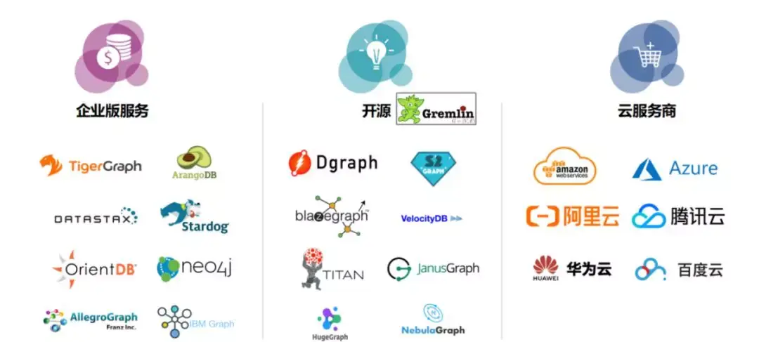 同时,在越来越多的公司上云的趋势下,国内外各大云服务商也将图数据库加到了自己的产品矩阵中。比如:AWS的Neptune、Azure的CosmosDB、阿里云的GraphDB、腾讯云的星图(TKGD)、华为云的GES等。