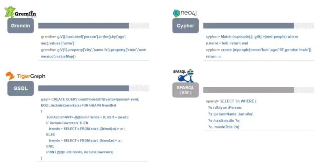 值得一提的是,在使用图数据库时,需要使用到图查询语言,而图查询语言也有多个不同形态的语言。典型的有:TinkerPop Gremlin、Neo4j的Cypher、TigerGraph的GSQL、用于RDF类图数据查询的SparQL等。