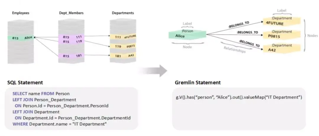 在关系型数据库中,可能存在三张表:员工信息表、员工与部门关系表、部门信息表,我们写SQL进行查找,需要进行两次JOIN操作才能获取Alice所处的部门名称。