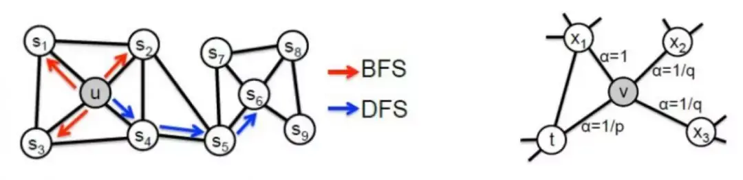 而广度优先游走策略相反将会促进游走不断的回头,去访问上一步结点的其他邻居结点。