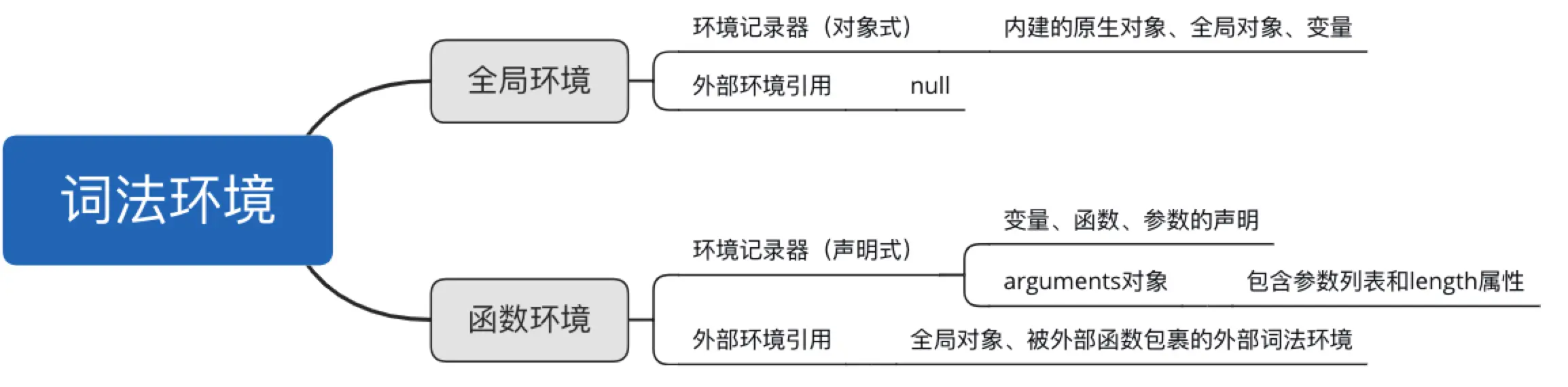 Object、Array等,环境记录器中记录着全局对象还有任何用户定义的一些变量,this值指向全局对象。 - 函数词法环境,环境记录器存储着函数内部的一些变量,外部环境引用可能是全局对象,也可能是包含该函数的外部词法环境。