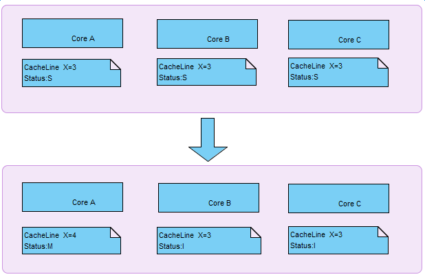 那么,假设有一个变量i=3(应该是包括变量i的缓存块,块大小为缓存行大小);已经加载到多核(a,b,c)的缓存中,此时该缓存行的状态为S;此时其中的一个核a改变了变量i的值,那么在核a中的当前缓存行的状态将变为M,b,c核中的当前缓存行状态将变为I。如下图: