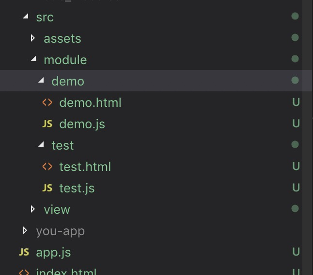 新建module文件,约定module目录里面每个文件目录必须有个html文件,还有一个与其名字相同的js文件作为入口文件。
