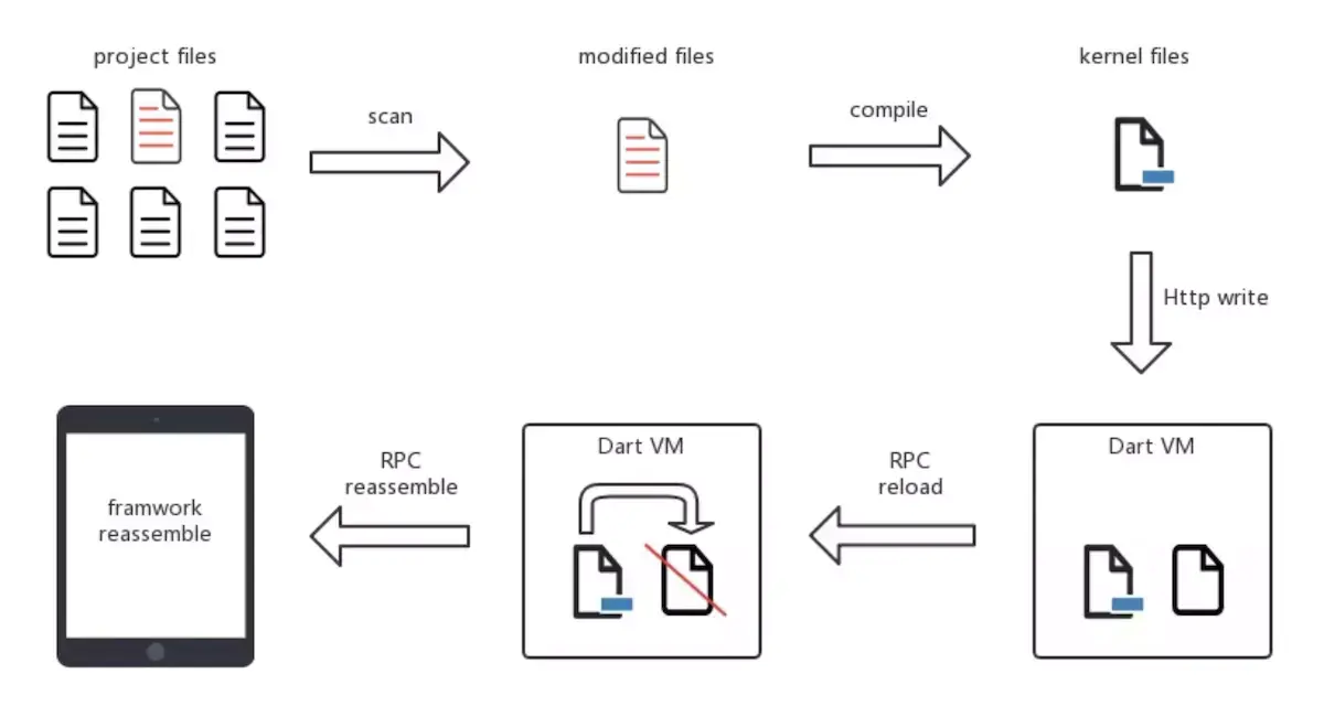 随后会通过HTTP Server将生成的kernel files文件发送给Dart VM虚拟机,虚拟机拿到kernel文件后会调用_reloadSources函数进行资源重载,将kernel文件注入正在运行的Dart VM中。当资源重载完成后,会调用RPC接口触发Widgets的重绘。