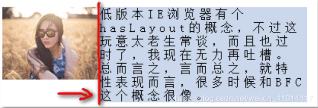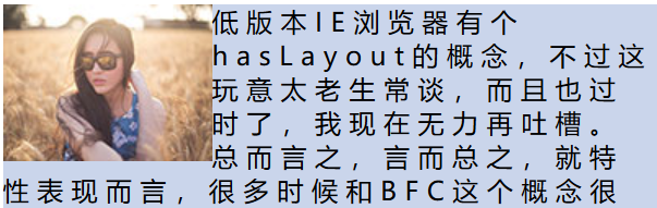 <style> img{ float:left; width:300px; height: 300px; margin-right: 20px; } </style> <div> <img src="test.jpg"> <p> 低版本IE浏览器有个hasLayout的概念,不过这玩意太老生常谈,而且也过时了,我现在无 力再吐槽。总而言之,言而总之,就特性表现而言,很多时候和BFC这个概念很像。 </p> </div>