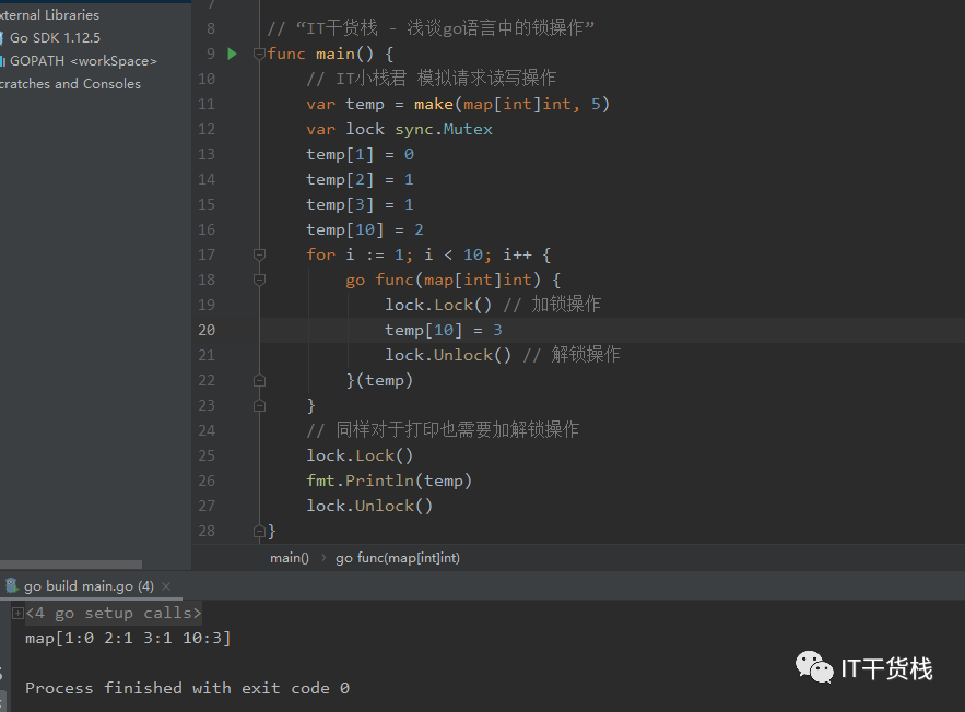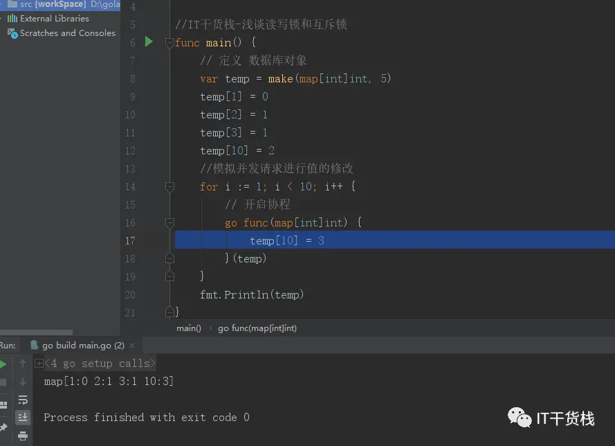 对于线程相关的问题在生产上其实排查相对而言是有点困难的。 在文件中也可以明确的显示出问题出现在17行,也就是我们在对于Map切片进行操作的时候。