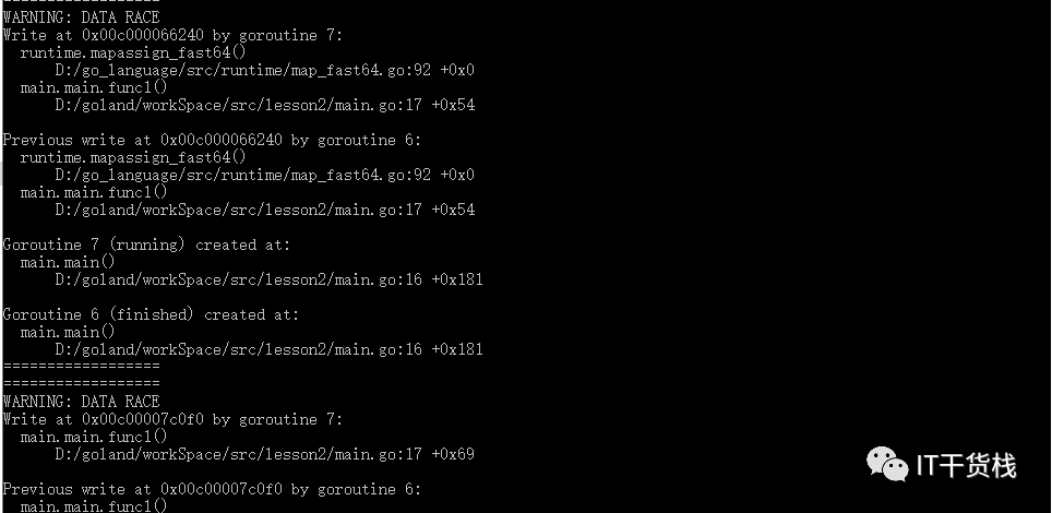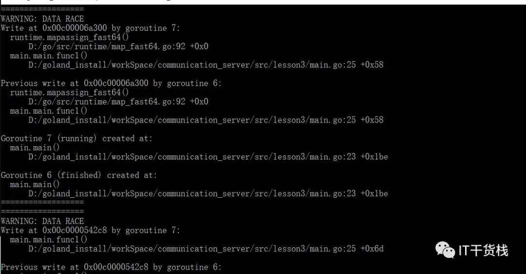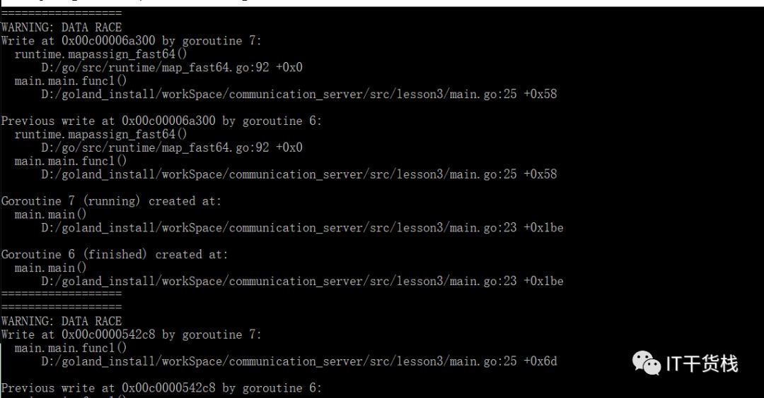 让我们使用一下go build -race 命令,最后得到的结果如下: